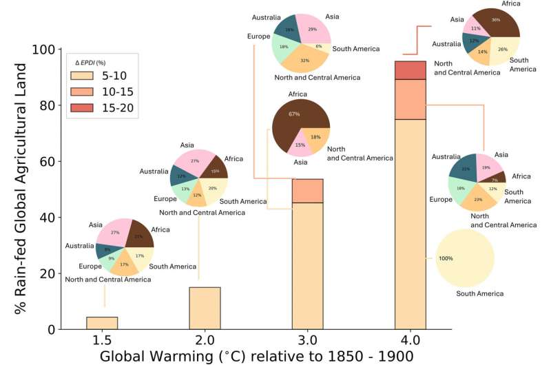 Yüksək qətnaməli peyk məlumatlarından istifadə edərək, komanda 1,5-2°C istiləşmədə yağışla qidalanan əkin sahələrinin yalnız kiçik bir hissəsində (təxminən 4%-15%) EPDI-də böyük artımların olacağını təxmin etdi. Lakin daha yüksək istiləşmə səviyyələrində mənzərə kəskin şəkildə dəyişir: yağışla qidalanan əkin sahələrinin 54%-də 3°C-də, 4°C-də isə təxminən 96%-də həddindən artıq yağıntıların əhəmiyyətli dərəcədə artması müşahidə edilə bilər.