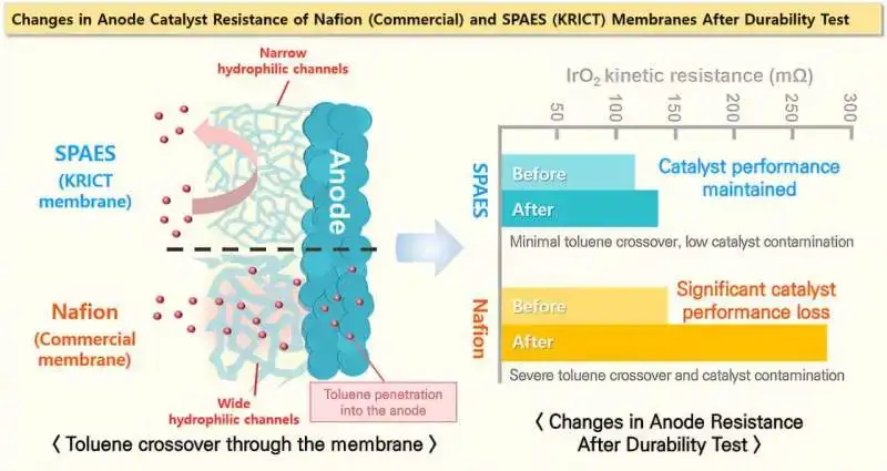 Bu narahatlıqları aradan qaldırmaq üçün tədqiqat qrupu membranda proton yolları kimi xidmət edən hidrofilik domenləri (təqribən 2,1 nm) olan yeni karbohidrogen əsaslı SPAES membranı dizayn etdi. Bu dar domenlər toluol molekullarının keçiriciliyini kəskin şəkildə azaldır, onların diffuziya qabiliyyətini 20 dəfə azaldır.