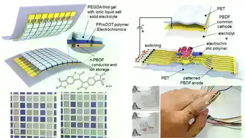 “Bu materialdan istifadə edərək, biz həmçinin aşağı enerji istehlakı (statik məzmun üçün 0,7 μW/sm 2 ) və enerji olmadan 24 saata qədər dayanıqlılığa malik çevik, tam rəngli, tam polimer elektroxrom displey nümayiş etdirdik .”