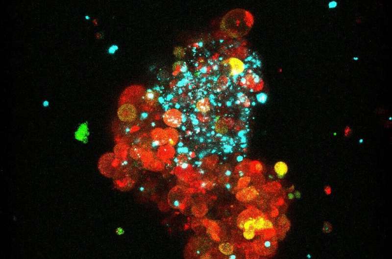 Redaktorların qeydləriİmmunitet sisteminin luminal döş xərçəngi şişlərinə necə hücum etdiyini göstərən laboratoriya modeli. Qırmızı rəngdə estrogen reseptoru ilə qarşılıqlı əlaqədə olmayan dəyişdirilmiş LCOR zülalının təsiri ilə mavi rəngdə təmsil olunan immun hüceyrələri tərəfindən hücuma məruz qalan estrogen reseptoru müsbət olan luminal döş xərçəngi hüceyrələri müşahidə olunur. Nəticədə şiş hüceyrələri ölür və yaşıl rənglə qeyd olunur. Kredit: Hospital del Mar Araşdırma İnstitutu