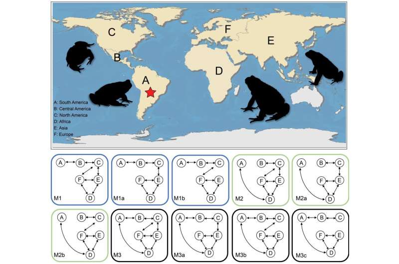 Redaktorların qeydləriXəritə (yuxarı) altı əsas biocoğrafi regionu vurğulayır: Cənubi Amerika (A), Mərkəzi Amerika (B), Şimali Amerika (C), Afrika (D), Asiya (E) və Avropa (F). Ulduz işarəsi Cənubi Amerikada Bufonidae-nin təxmini mənşəyini göstərir. Aşağı panel Cənubi Amerikadan (A) gələn on mümkün yayılma marşrutunu təsvir edir və oxlarla yayılma istiqamətini göstərir. Bu modellər üç əsas növə bölünür: (M1) şimala doğru genişlənmə və quru körpü ilə əlaqəli dispersiya, (M2) Trans-Atlantik uzun məsafəli dağılma və (M3) Cənubi Amerikadan həm Şimali Amerikaya, həm də Afrikaya qarışıq rejimli dağılma. PhyloPi-dən (https://www.phylopic.org/images) qaynaqlanan qurbağa siluetləri. Kredit: Royal Society B Proceedings of the Royal Society: Biologiya Elmləri (2025). DOI: 10.1098/rspb.2025.1928